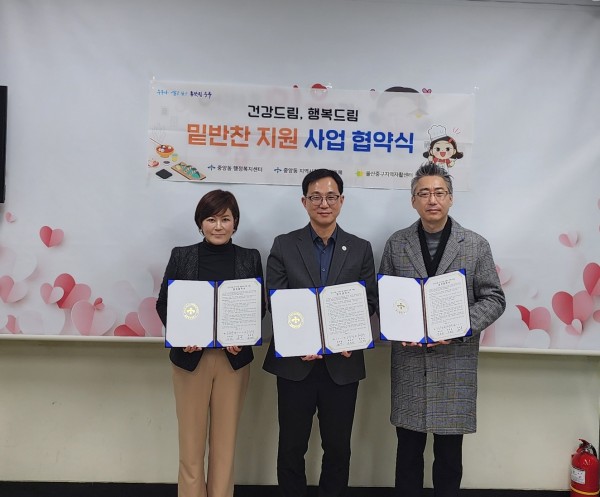 울산 중구 중앙동 행정복지센터(동장 김하형)와 중앙동 지역사회보장협의체(위원장 엄진영), 울산중구지역자활센터(센터장 배정희)는 지난 2월 9일 중앙동 행정복지센터에서 '건강드림, 행복드림 밑반찬 지원사업' 업무 협약을 체결했다.